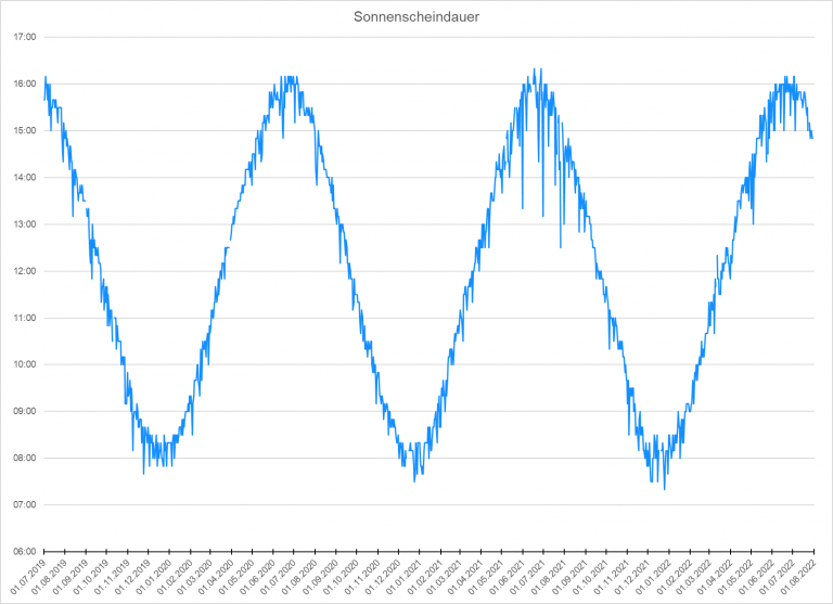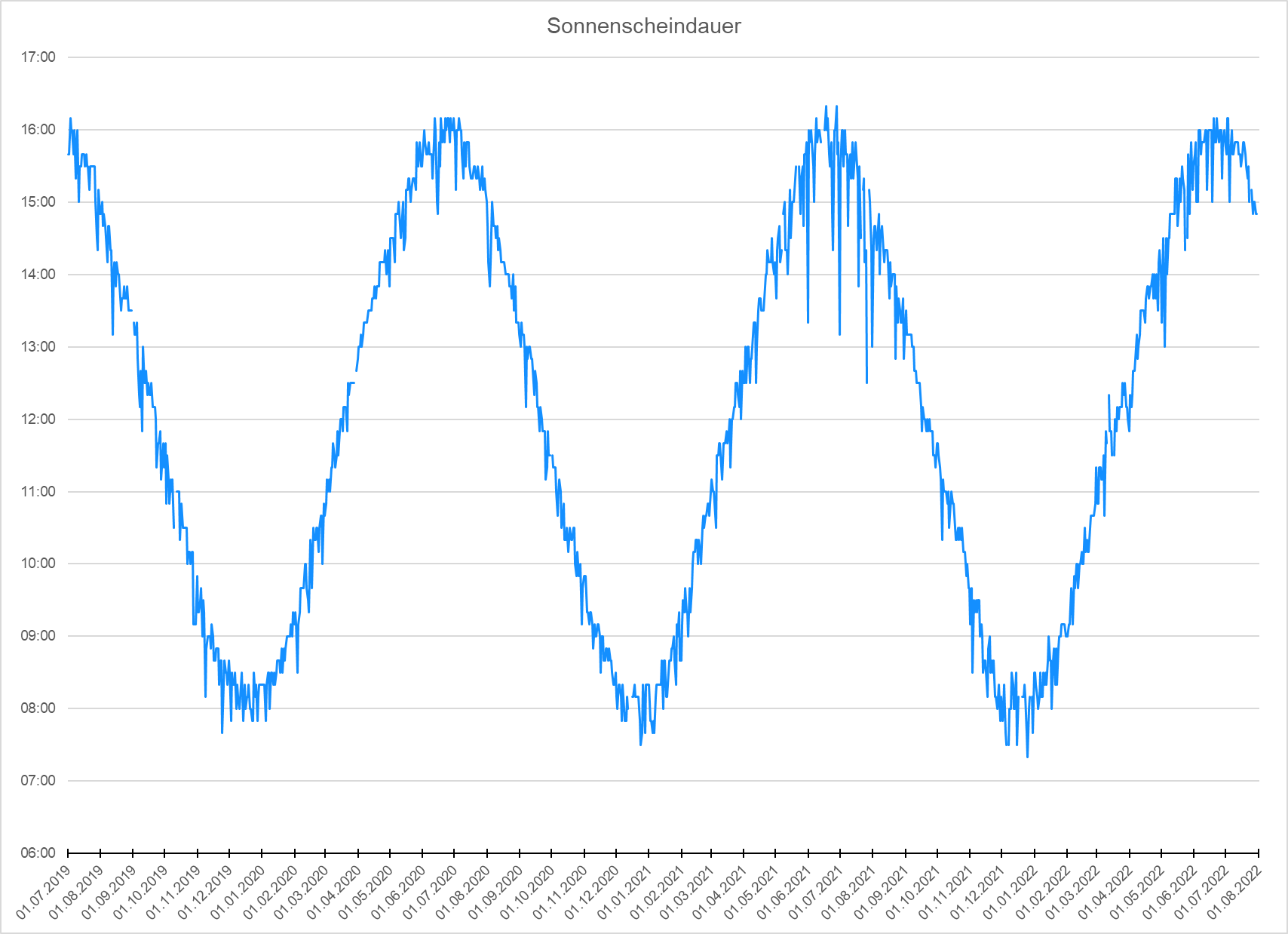 Dies ist abweichend von der astronomischen Definition als Zeitpunkt, wenn die Oberkante der Sonne den geozentrischen Horizont über- bzw. unterschreitet. Entsprechend ist meine tägliche Sonnenscheindauer größer als die Standard Tageslänge.