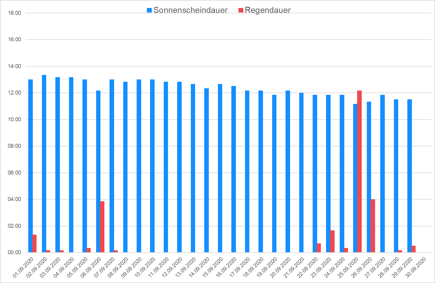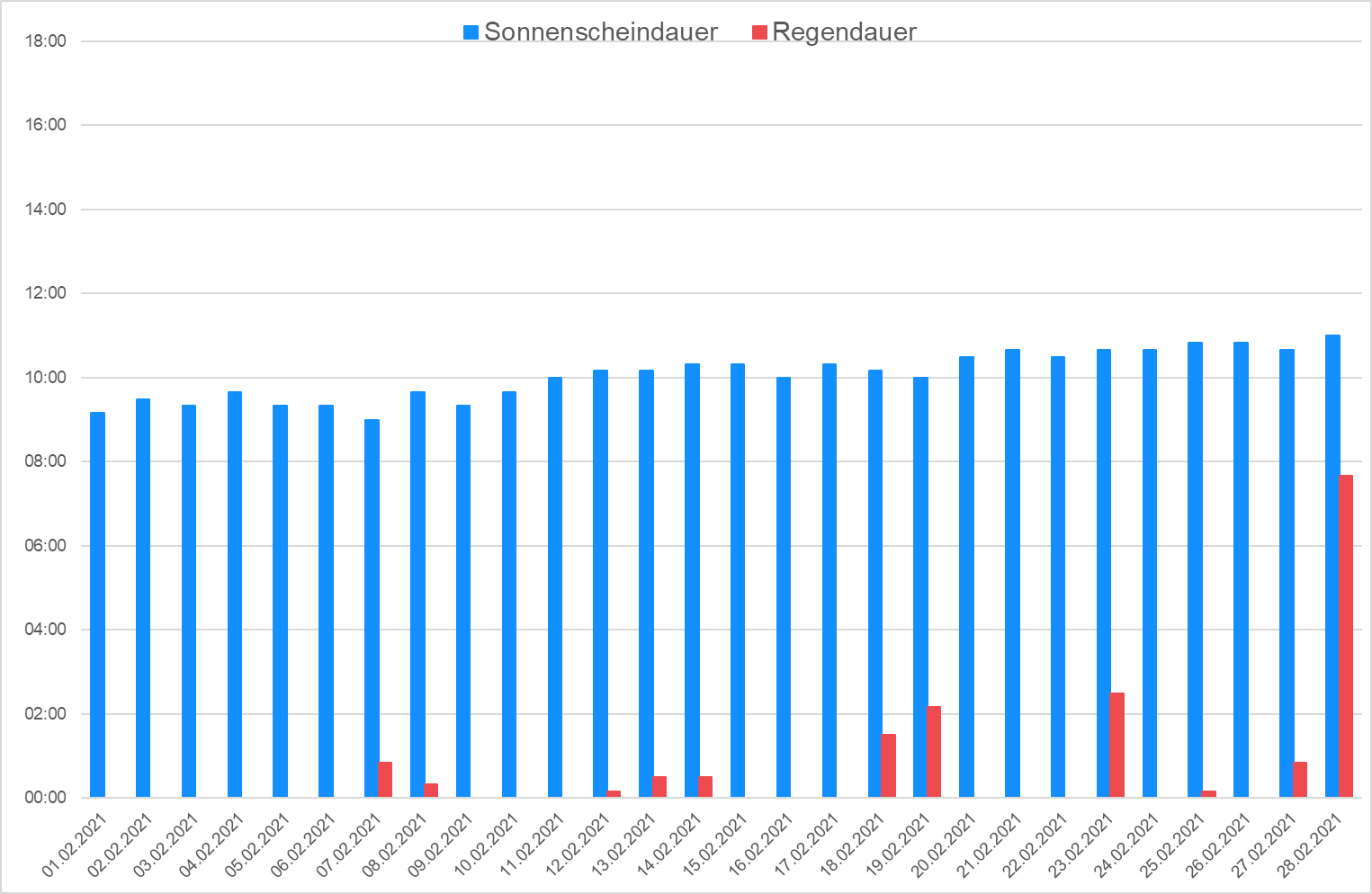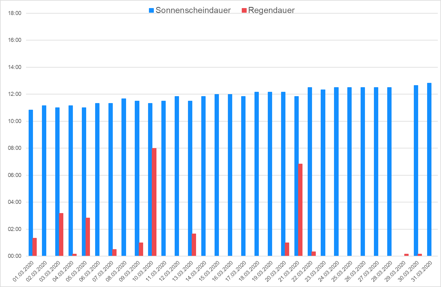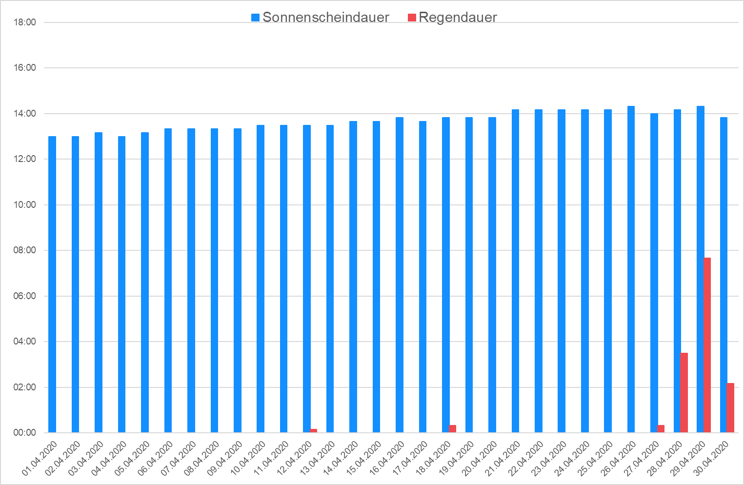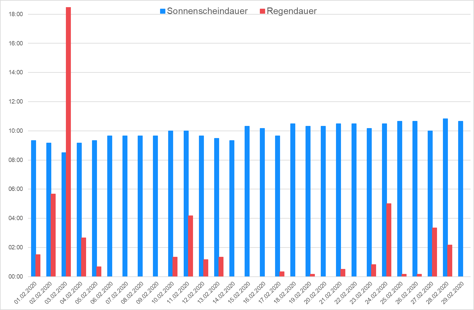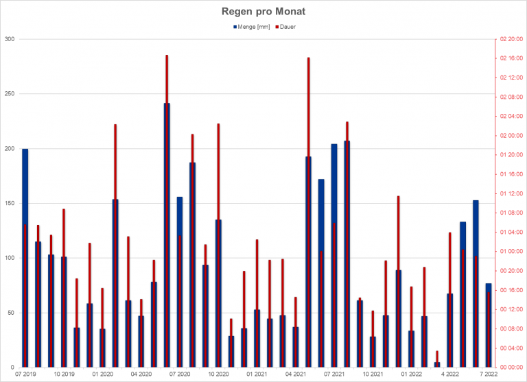 Die höheren Niederschlagsmengen im Sommer sind typisch für das für München erwartete Kontinentalklima. Das Verhältnis von Regenmenge zu -dauer zeigt deutlich, daß es im Herbst und Winter bei ähnlicher Regendauer wesentlich weniger Niederschlag gab; typisch herbstlicher Nieselregen im Gegensatz zu heftigen Wolkenbrüchen und Sommergewittern. Der Ausreißer im Februar 2020 geht im Wesentlichen auf den 3.2. zurück, an dem es mehr als 19 Stunden geregnet hat.