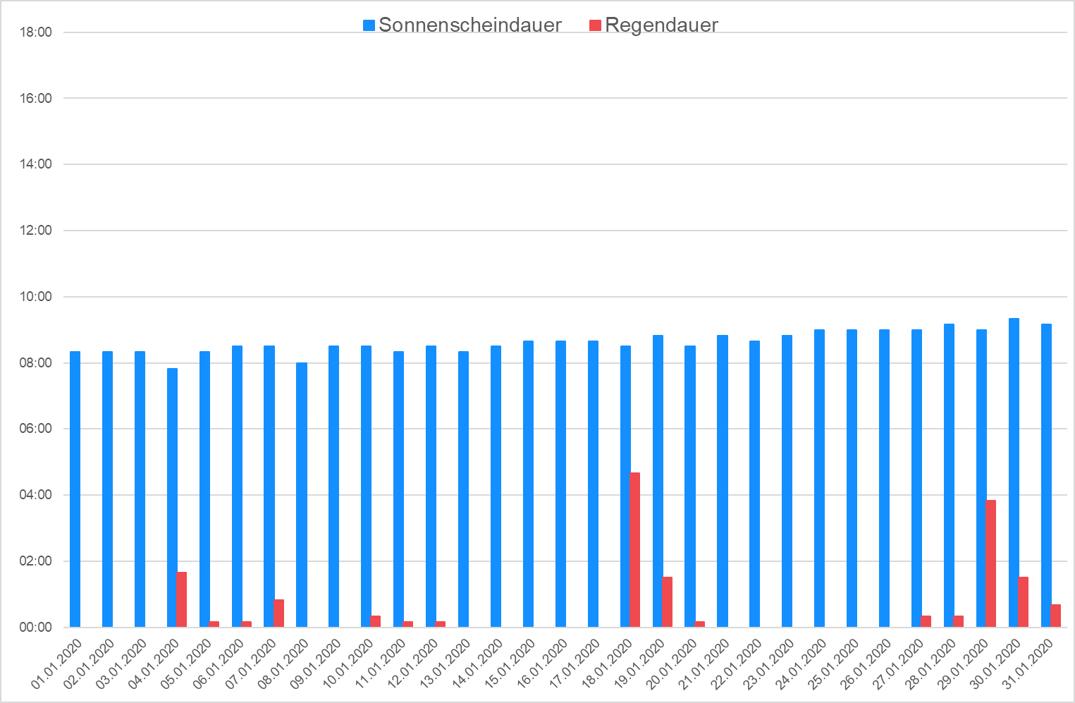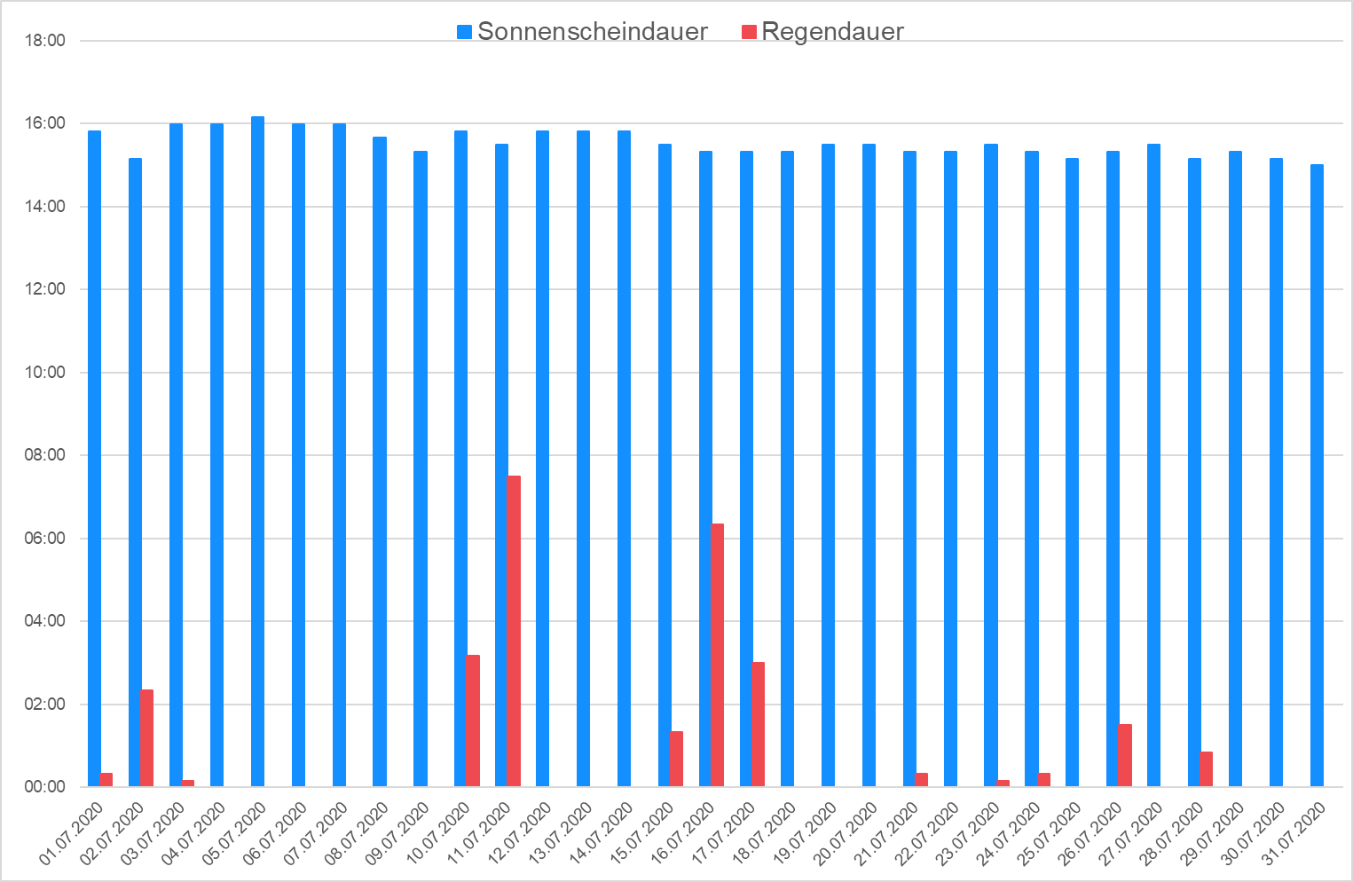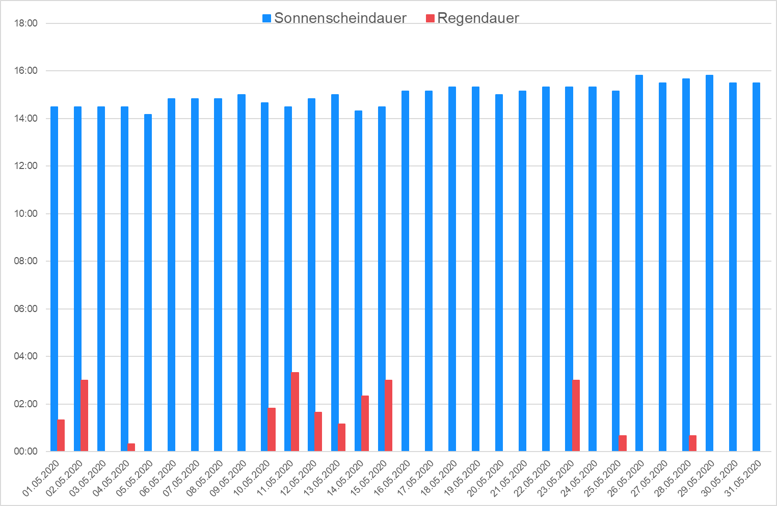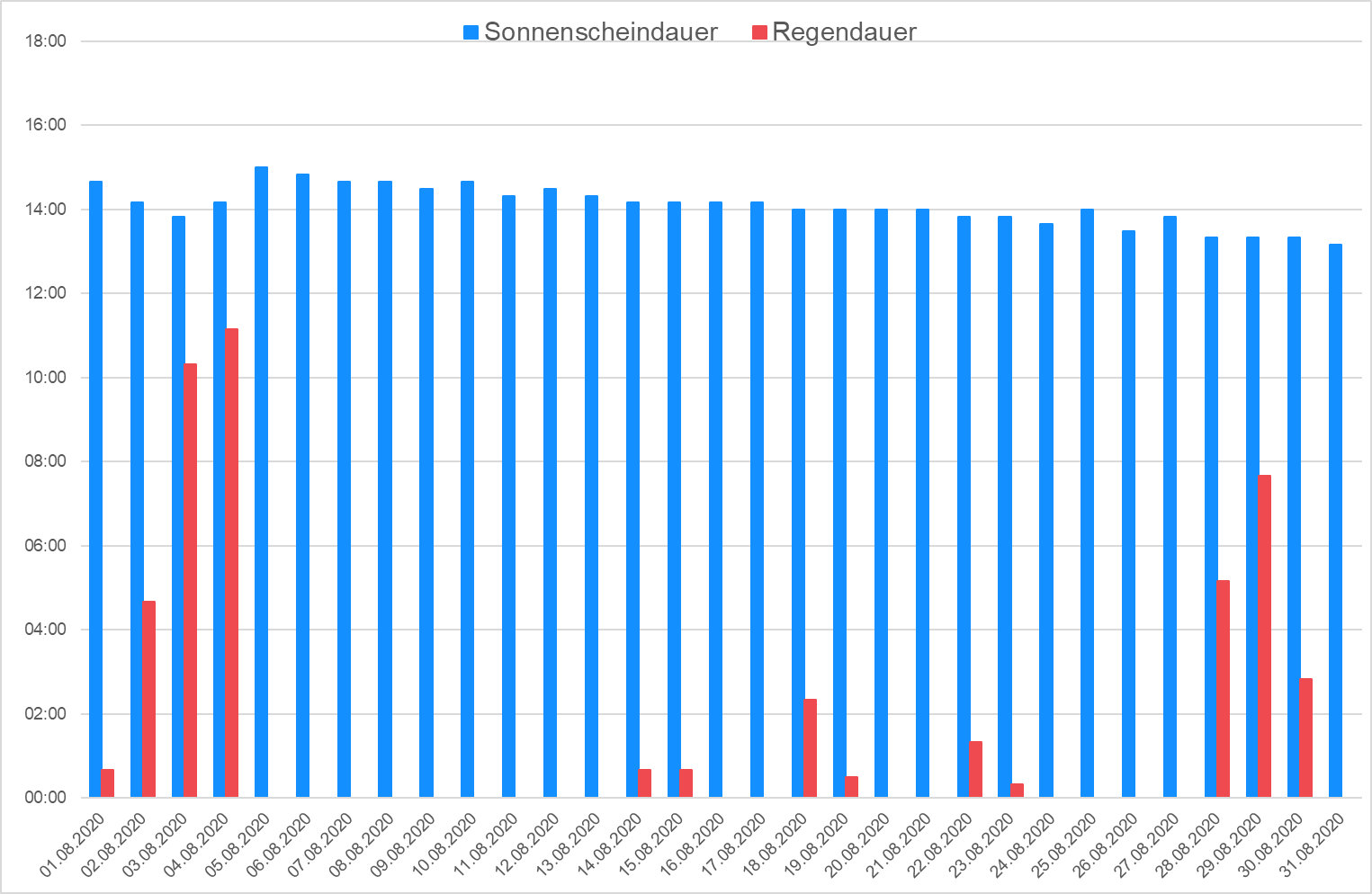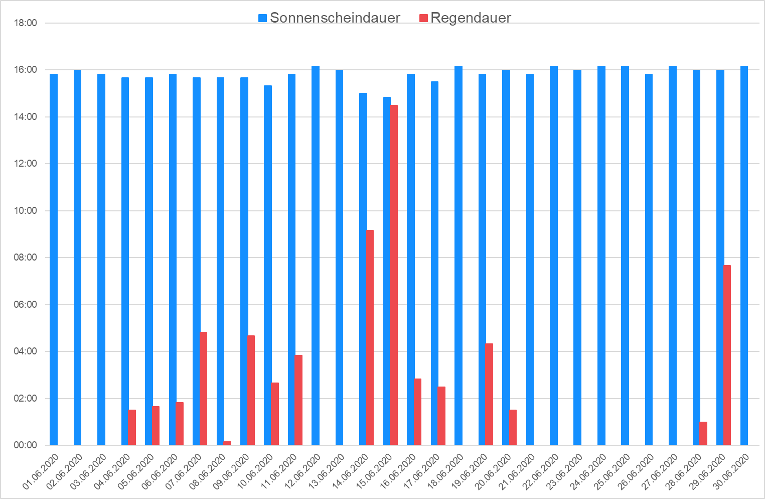 Die höheren Niederschlagsmengen im Sommer sind typisch für das für München erwartete Kontinentalklima. Das Verhältnis von Regenmenge zu -dauer zeigt deutlich, daß es im Herbst und Winter bei ähnlicher Regendauer wesentlich weniger Niederschlag gab; typisch herbstlicher Nieselregen im Gegensatz zu heftigen Wolkenbrüchen und Sommergewittern. Der Ausreißer im Februar 2020 geht im Wesentlichen auf den 3.2. zurück, an dem es mehr als 19 Stunden geregnet hat.