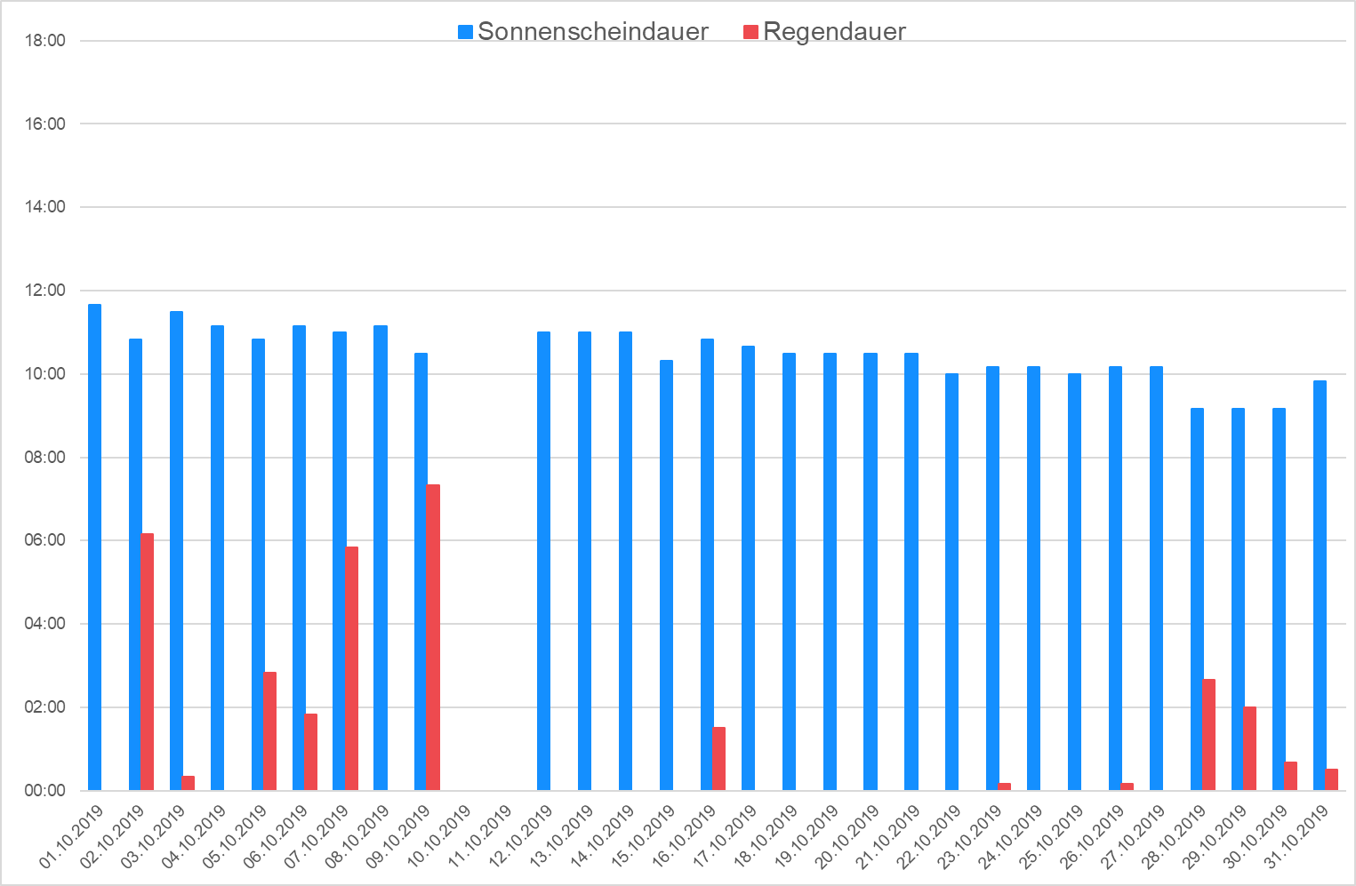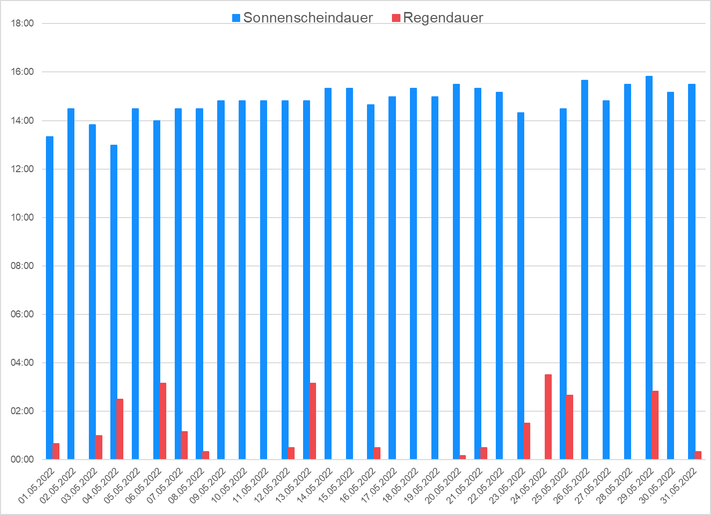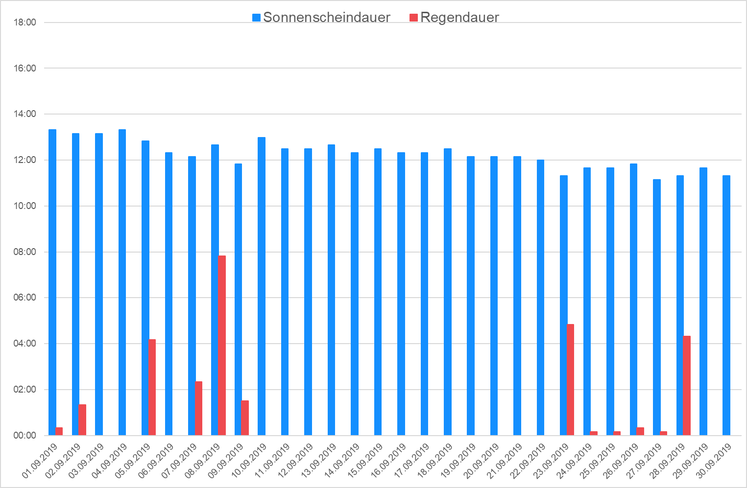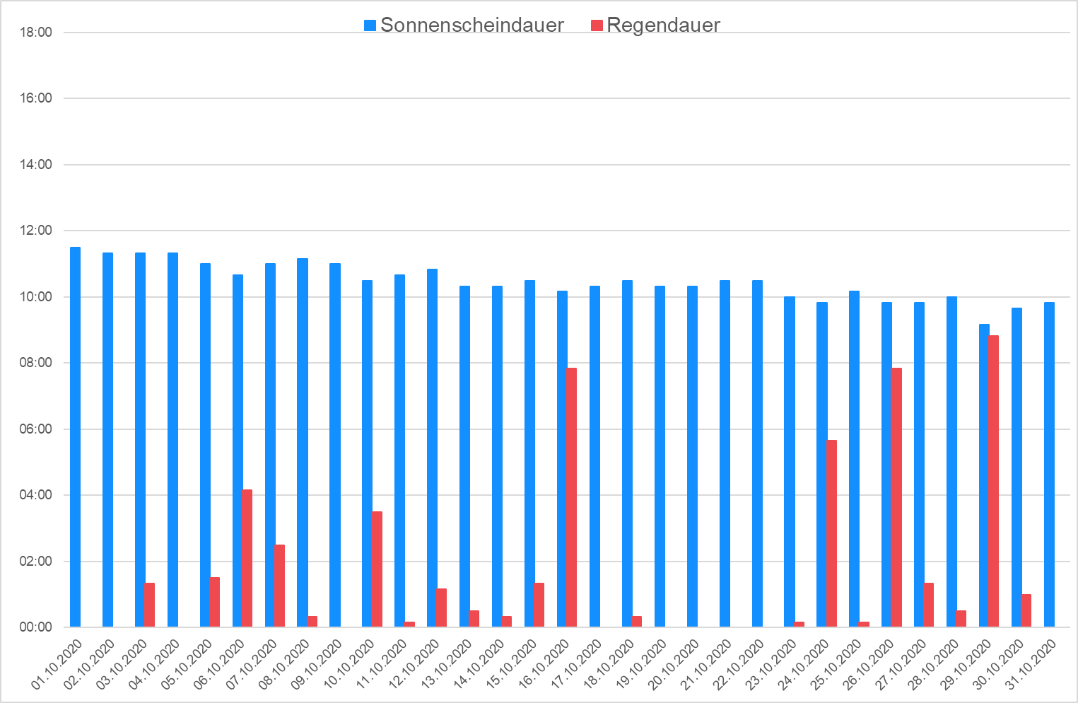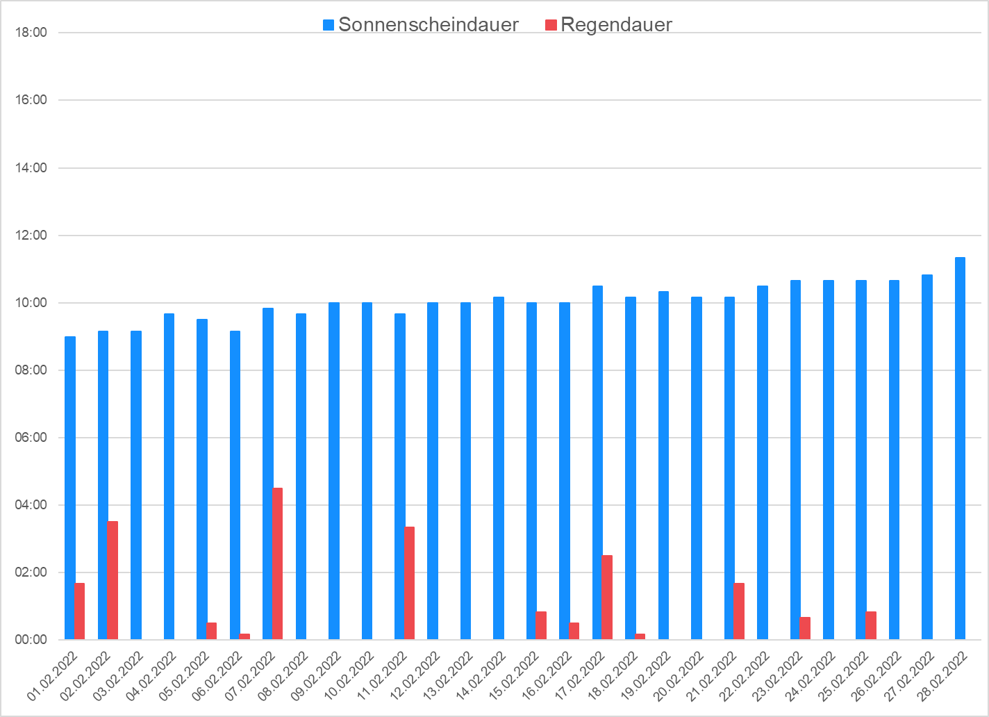 Die höheren Niederschlagsmengen im Sommer sind typisch für das für München erwartete Kontinentalklima. Das Verhältnis von Regenmenge zu -dauer zeigt deutlich, daß es im Herbst und Winter bei ähnlicher Regendauer wesentlich weniger Niederschlag gab; typisch herbstlicher Nieselregen im Gegensatz zu heftigen Wolkenbrüchen und Sommergewittern. Der Ausreißer im Februar 2020 geht im Wesentlichen auf den 3.2. zurück, an dem es mehr als 19 Stunden geregnet hat.