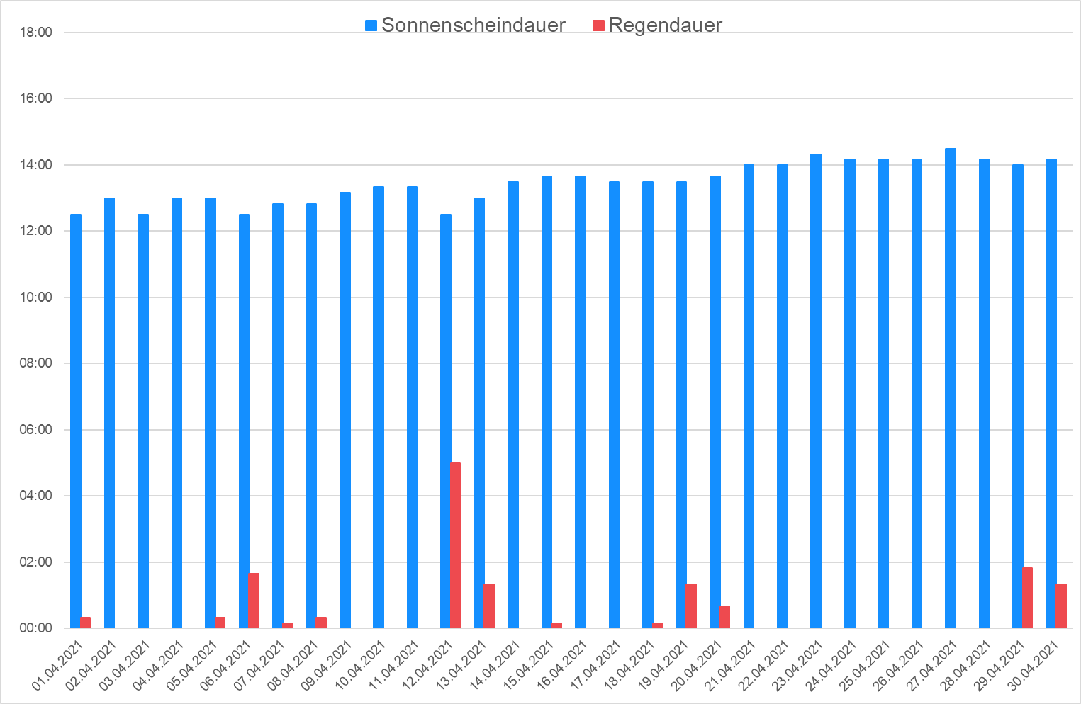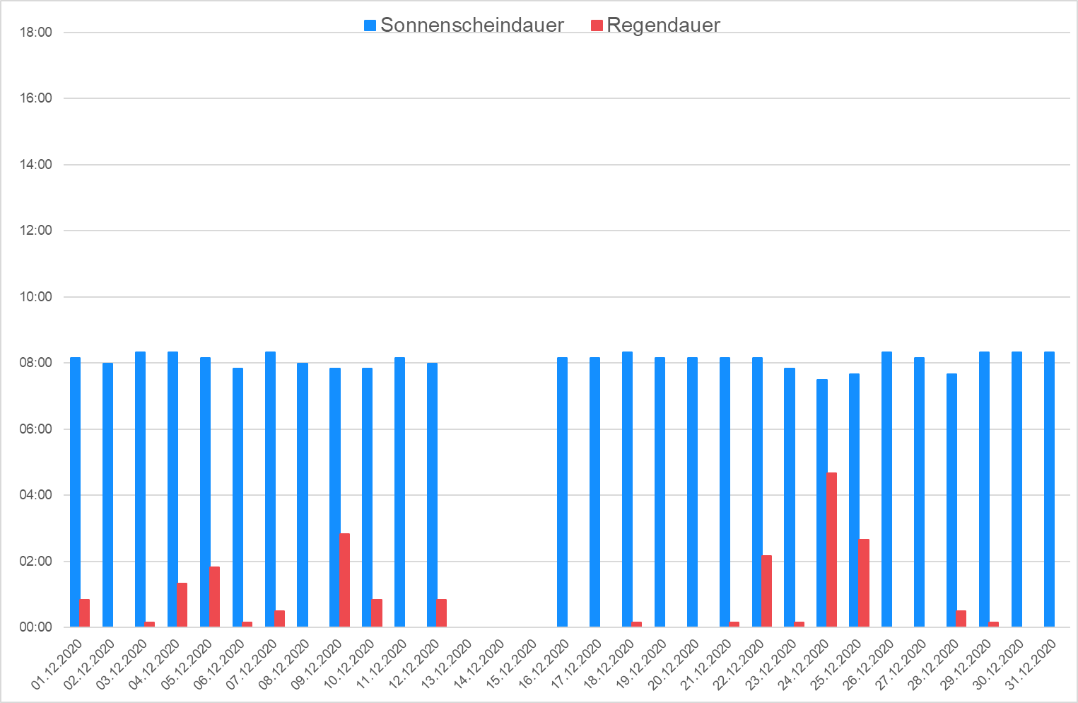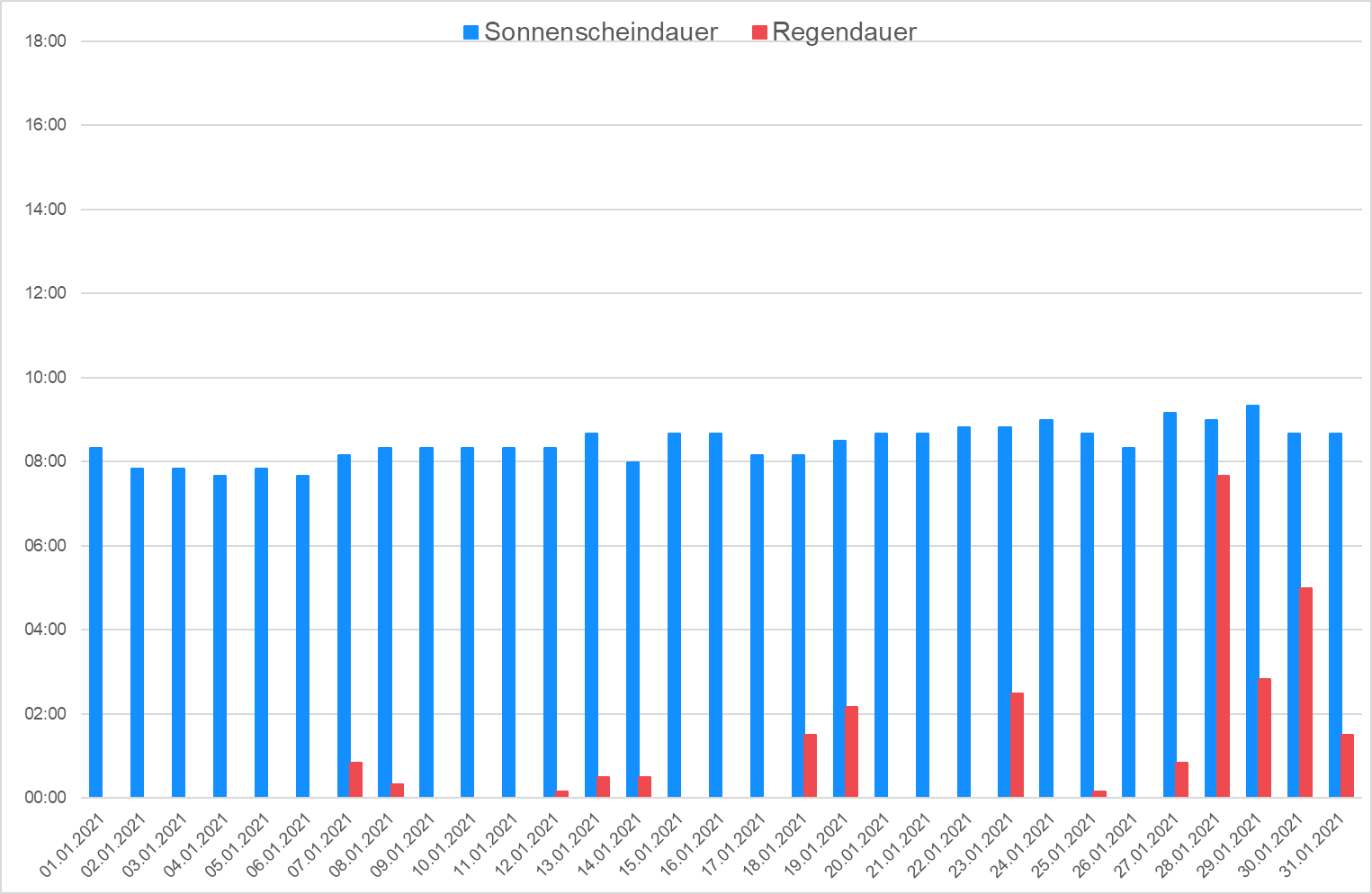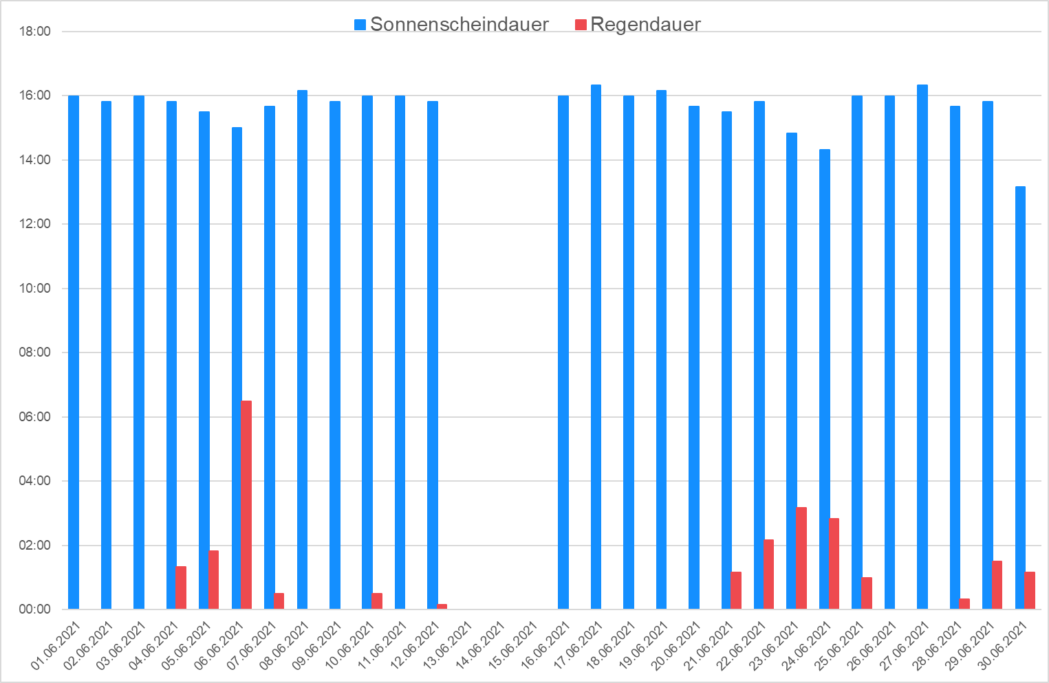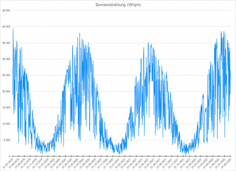 In den Sommermonaten, wenn die Tage lang sind und die Sonne hoch über dem Horizont steht, sorgen Wolken und Niederschlag für größere Schwankungen. In den Wintermonaten, wo die Sonne nur kurz und schwach scheint und es typischerweise mehr Bewölkung und Niederschlag gibt, sind die täglichen Schwankungen wesentlich geringer. Deutlich erkennbar sind auch die längeren Schönwetterphasen im April 2020 und Juni 2021.