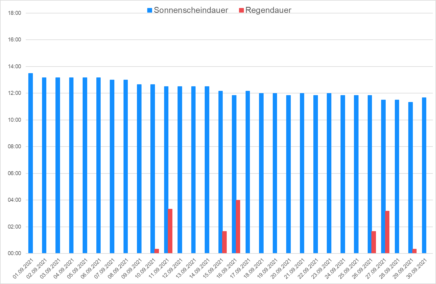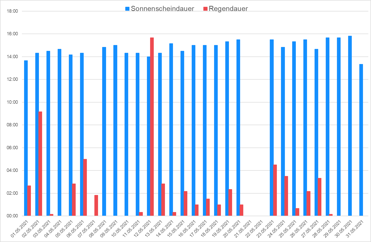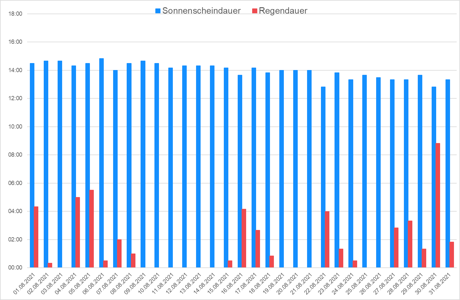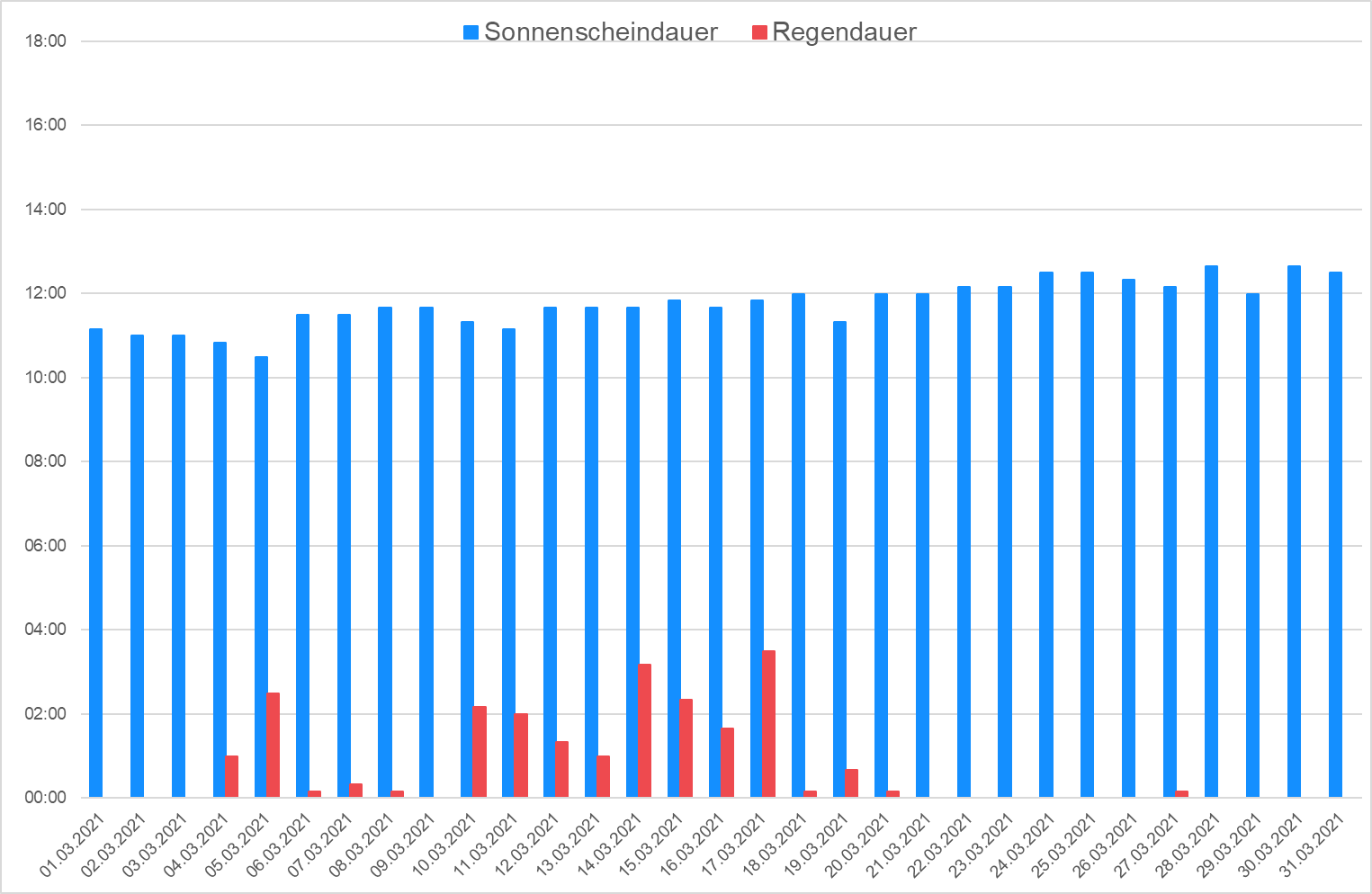 In den Sommermonaten, wenn die Tage lang sind und die Sonne hoch über dem Horizont steht, sorgen Wolken und Niederschlag für größere Schwankungen. In den Wintermonaten, wo die Sonne nur kurz und schwach scheint und es typischerweise mehr Bewölkung und Niederschlag gibt, sind die täglichen Schwankungen wesentlich geringer. Deutlich erkennbar sind auch die längeren Schönwetterphasen im April 2020 und Juni 2021.