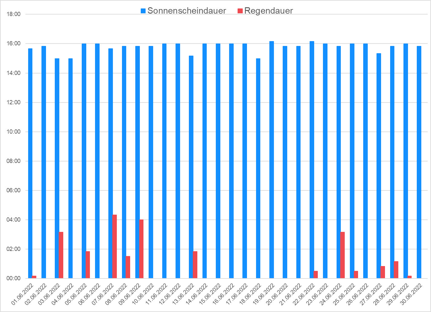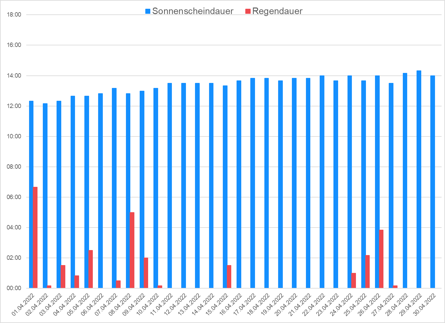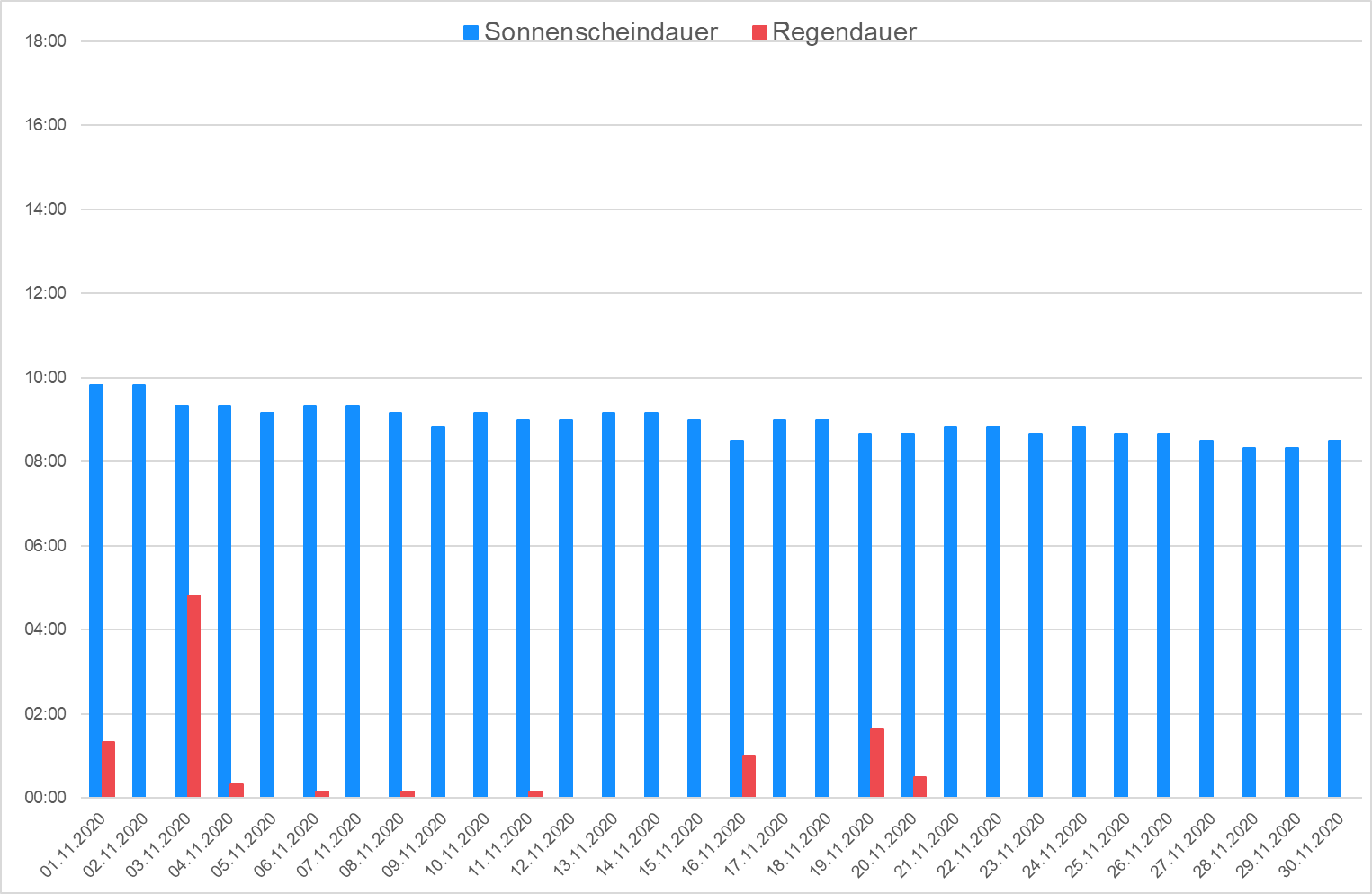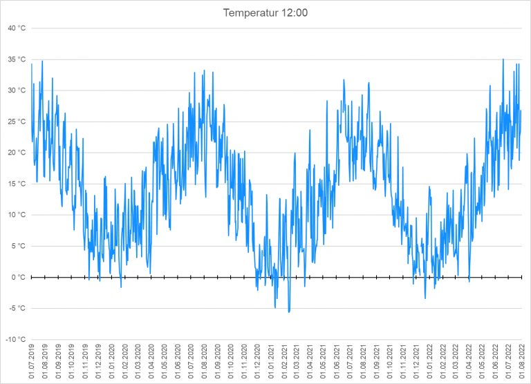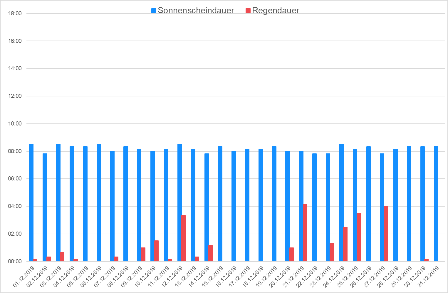 In den Sommermonaten, wenn die Tage lang sind und die Sonne hoch über dem Horizont steht, sorgen Wolken und Niederschlag für größere Schwankungen. In den Wintermonaten, wo die Sonne nur kurz und schwach scheint und es typischerweise mehr Bewölkung und Niederschlag gibt, sind die täglichen Schwankungen wesentlich geringer. Deutlich erkennbar sind auch die längeren Schönwetterphasen im April 2020 und Juni 2021.