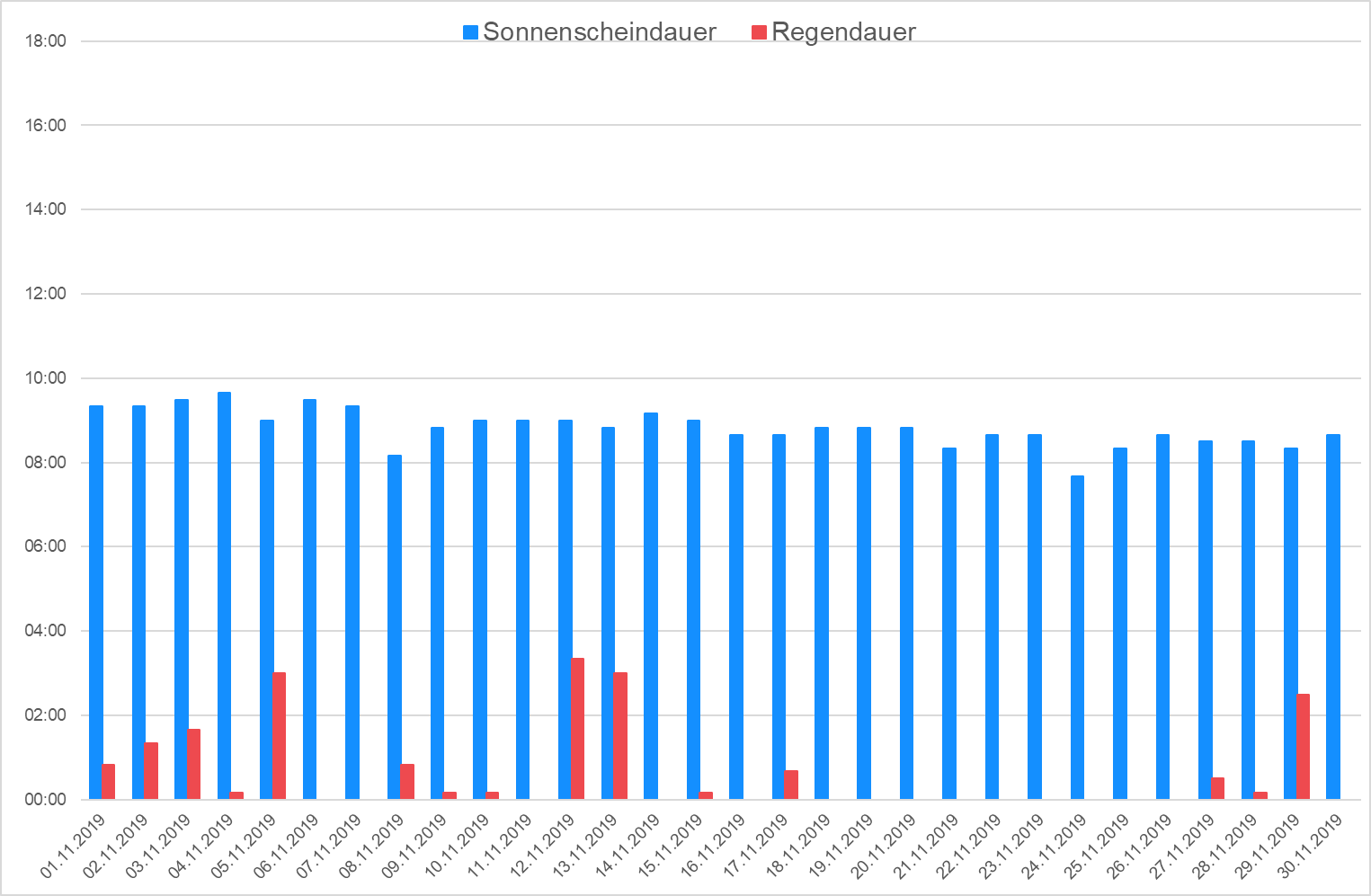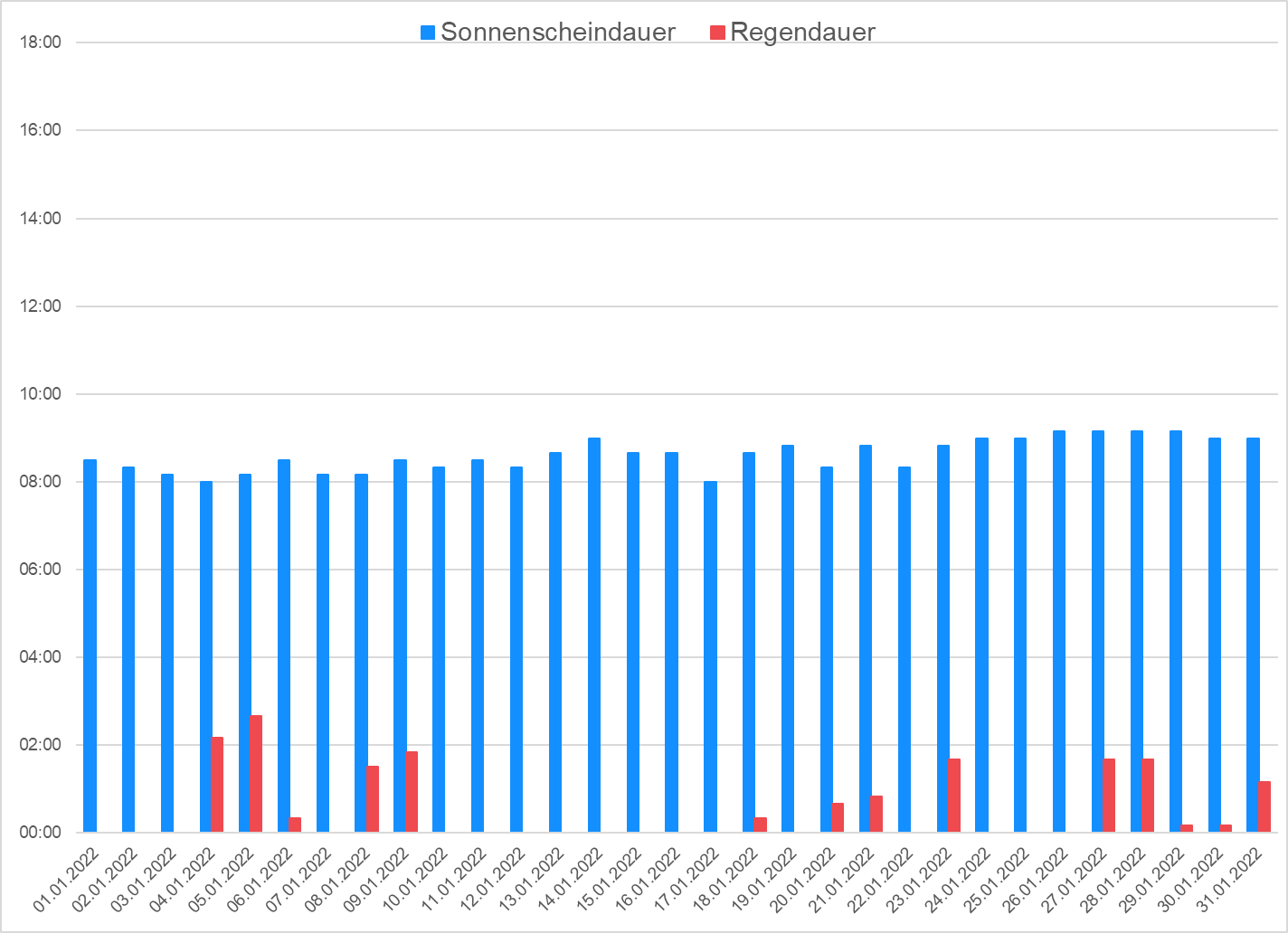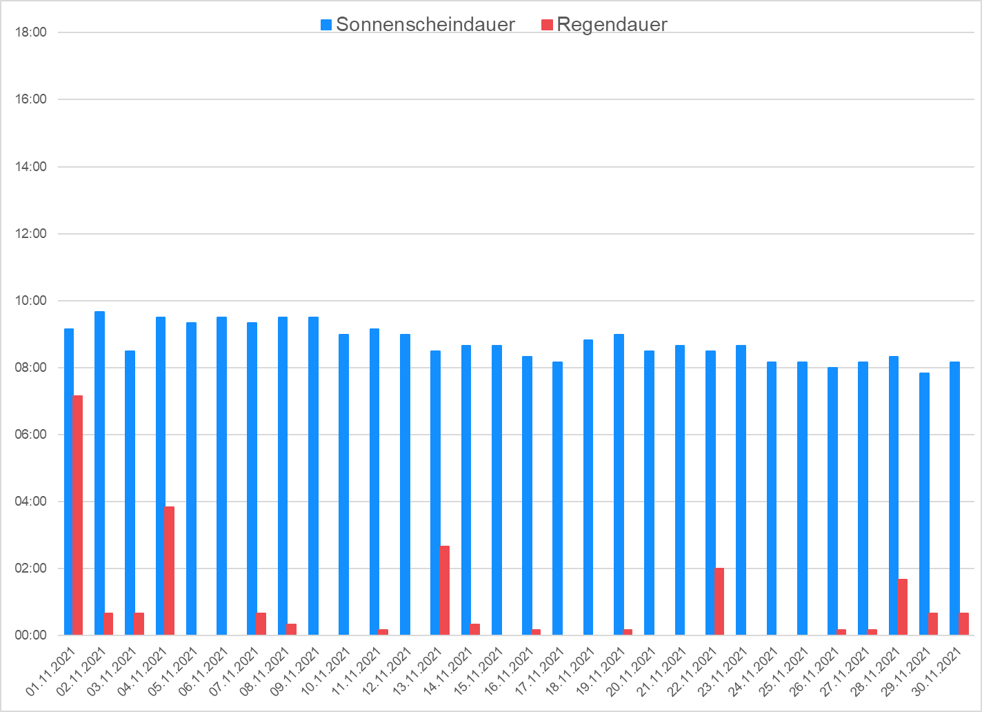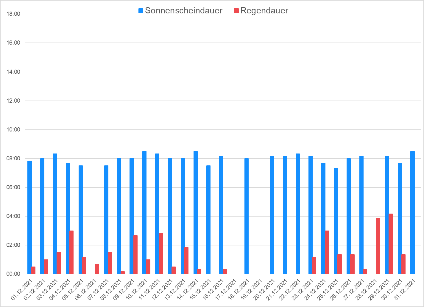 In den Sommermonaten, wenn die Tage lang sind und die Sonne hoch über dem Horizont steht, sorgen Wolken und Niederschlag für größere Schwankungen. In den Wintermonaten, wo die Sonne nur kurz und schwach scheint und es typischerweise mehr Bewölkung und Niederschlag gibt, sind die täglichen Schwankungen wesentlich geringer. Deutlich erkennbar sind auch die längeren Schönwetterphasen im April 2020 und Juni 2021.