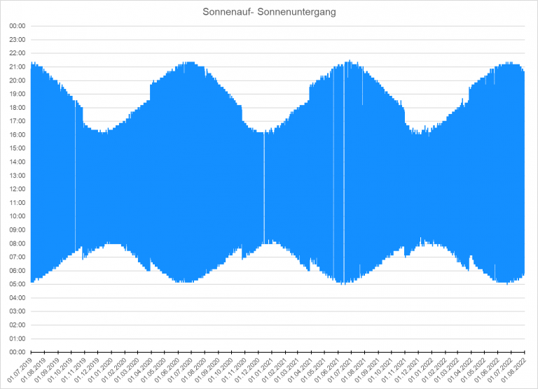 Klar zu erkennen sind die Sommer- / Winterzeitumstellungen. Durch die Bahnbewegung der Erde um die Sonne ändert sich die Tageslänge nicht gleichmäßig abends und morgens. Die Daten für April und Mai 2020 z.B. zeigen deutlich, daß die Zunahme der Tageslänge hauptsächlich durch den früheren Sonnenaufgang gegeben ist.
